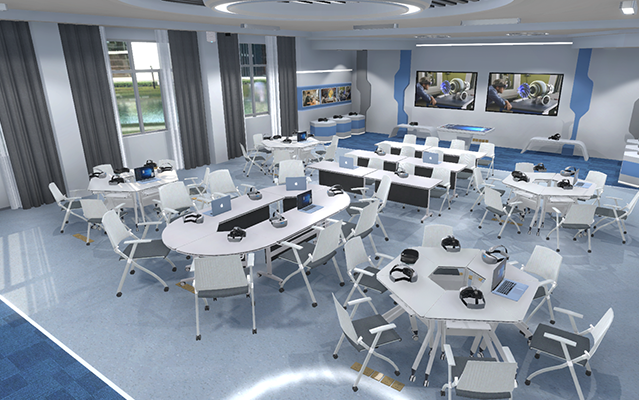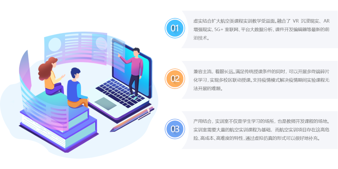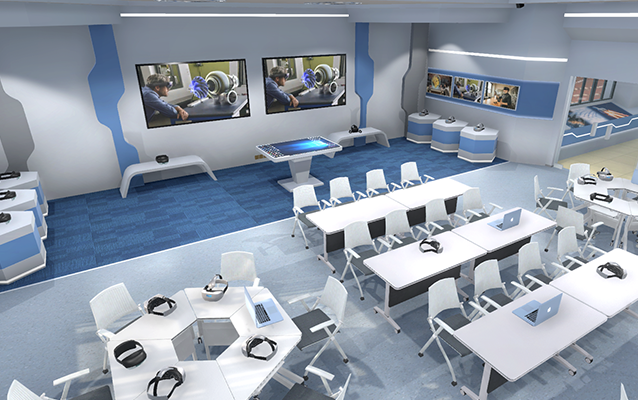 航空类实训室通过实体课堂教学区的设置将特色的教学设备、复杂的教学仪器进行实体展示,配合虚拟仿真的课程内容和沉浸式的体验设备,将难以在课堂现场展示和操作的高成本、高危险、高难度的航空类实训有效地开展起来,以虚拟的形式补充实体实训中难以开展的部分,通过以虚补实,虚实结合的全新教学模式增强现场学生的体验感和互动性,扩大航空课程的受益面。