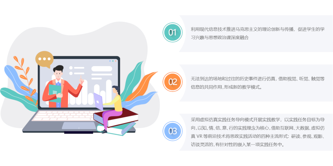 高校的马克思主义思想政治理论课程承担着全校学生思想教育的责任和义务。高校思政实践活动目前处于书本和平说层面,理论与实际的结合限于教材上和课堂教学中重视理论证明和对实际的描述,而实际证明和实践探索很不充分,甚至缺乏。通过思政实训室的建设,能更好地解决思政实践活动中存在的实际问题,能够将思政实践内容资源和思政实践活动流程有效融合,最大化地满足和提升学生思政实践活动的体验和实践综合能力的提升,进一步提高思政实践教学效率,更好的实现思政实践育人的教育目的和意义。