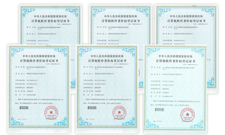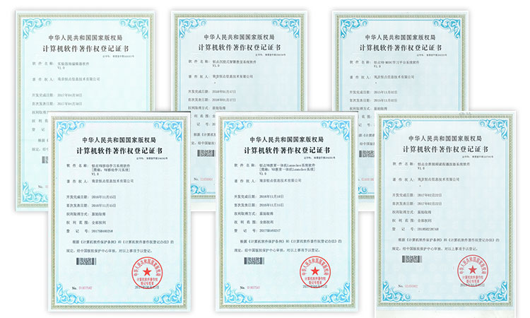 截至目前,经中华人民共和国国家版权局审核批准,南京恒点信息技术有限公司申请的12项软件著作权符合《计算机软件保护条例》和《计算机软件著作权登记办法》的规定,原始取得该权利,并获得中华人民共和国国家版权局颁发的《计算机软件著作权登记证书》。