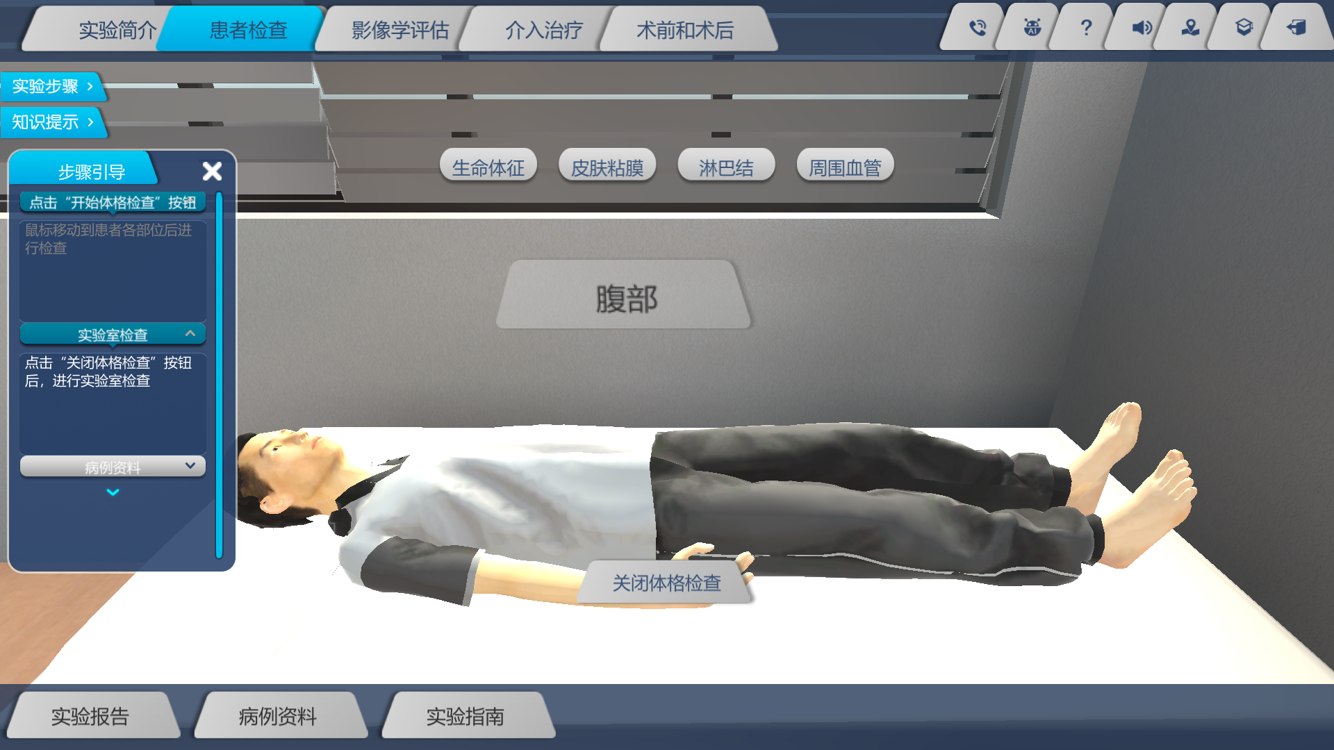 实验围绕“肝癌病理特征”这一底层原理知识点,建立“诊断—治疗—评估”完整临床诊疗环路。涵盖“患者接诊”“影像诊断”“介入手术”“术后评估”四个模块,构思了“认知-分析-综合-深化”递进式的实验层次。旨在对肝癌的影像学诊断及术后评估、肝动脉化疗栓塞术情景模拟,提高使用者的影像诊断水平及介入操作技术,为医学综合性人才的培养提供更大的支持。