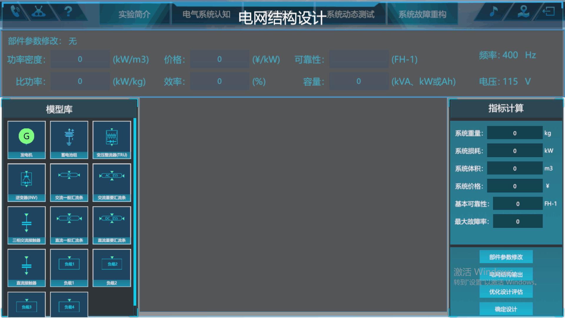 为了培养学生对电气系统的相关知识学习,特准备了电网结构设计环节供学生进行学习,学生可根据已掌握的知识在开放的环境下进行自由设计飞机供电电气系统并通过不同设计内容进行优化评估;