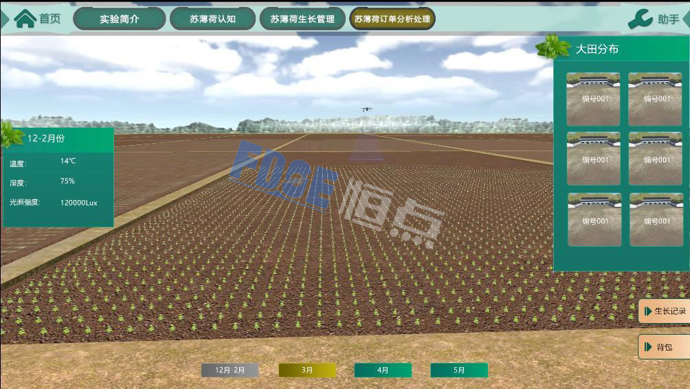 虚拟仿真技术以源于真实的数据作为系统参数,高度还原复杂多变的自然因素,构建全面的虚拟农业生产环境。因此,对场地、材料的需求较小,可以实现低成本教学。模拟实验条件下可以实现零生长周期,并通过3D模拟图像,直观地展现漫长、细微的生长机理。