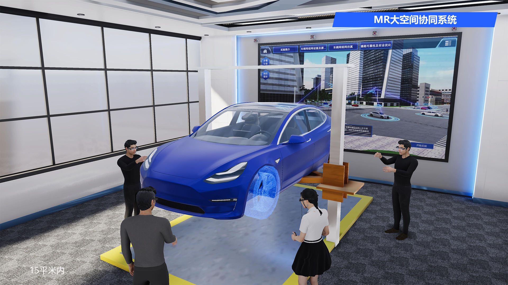 MR大空间协同系统可以在有限的空间中呈现无限的世界。体验者置身于设备房间中,乍看空无一物,但头戴显示设备(MR智能眼镜和VR虚拟现实眼镜)能在真是空间中呈现各种各样的虚拟场景和物体。