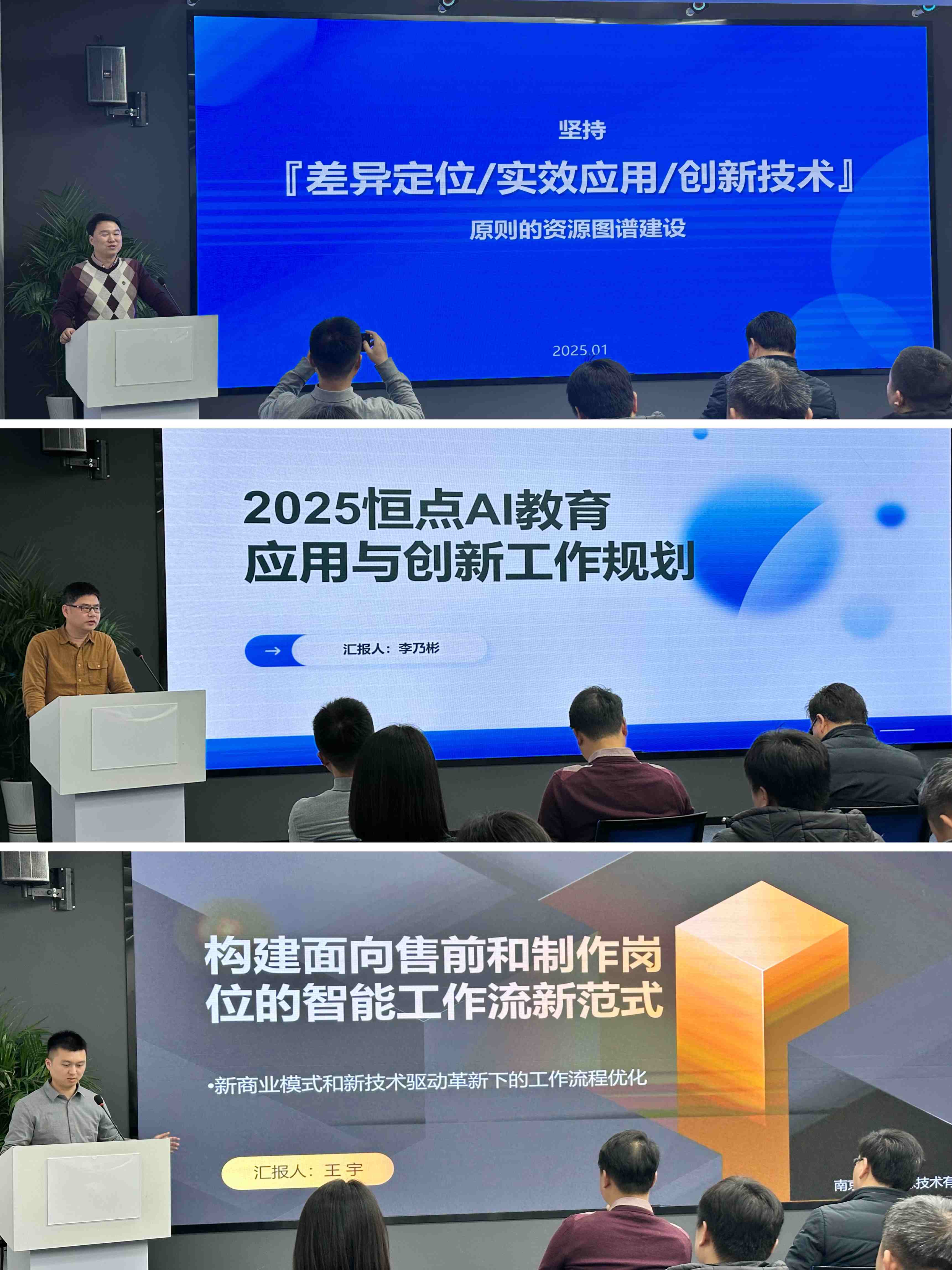 随后,恒点自主产品部、数字资源部、研发部的部门负责人,相继做了2024年的工作总结和2025年工作规划,围绕“整合”与“裂变”,深入生产力整合、业务资源整合、渠道整合、市场整合和资本整合,持续不断创新虚拟仿真生态链发展。