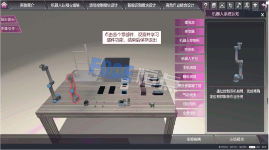 为应对上述挑战,恒点与南京理工大学联合开发“复杂环境下智能机器人高危作业虚拟仿真实验”,通过虚拟仿真技术,为学生和研究人员提供了一个高度逼真的实验环境。该实验设计了“系统集成-运动控制-智能感知-双臂协作”四个逐层递进的实验教学模块,底层数据源于科研和工程实际,高度逼真地再现了电力系统复杂环境下智能机器人控制的核心要素。