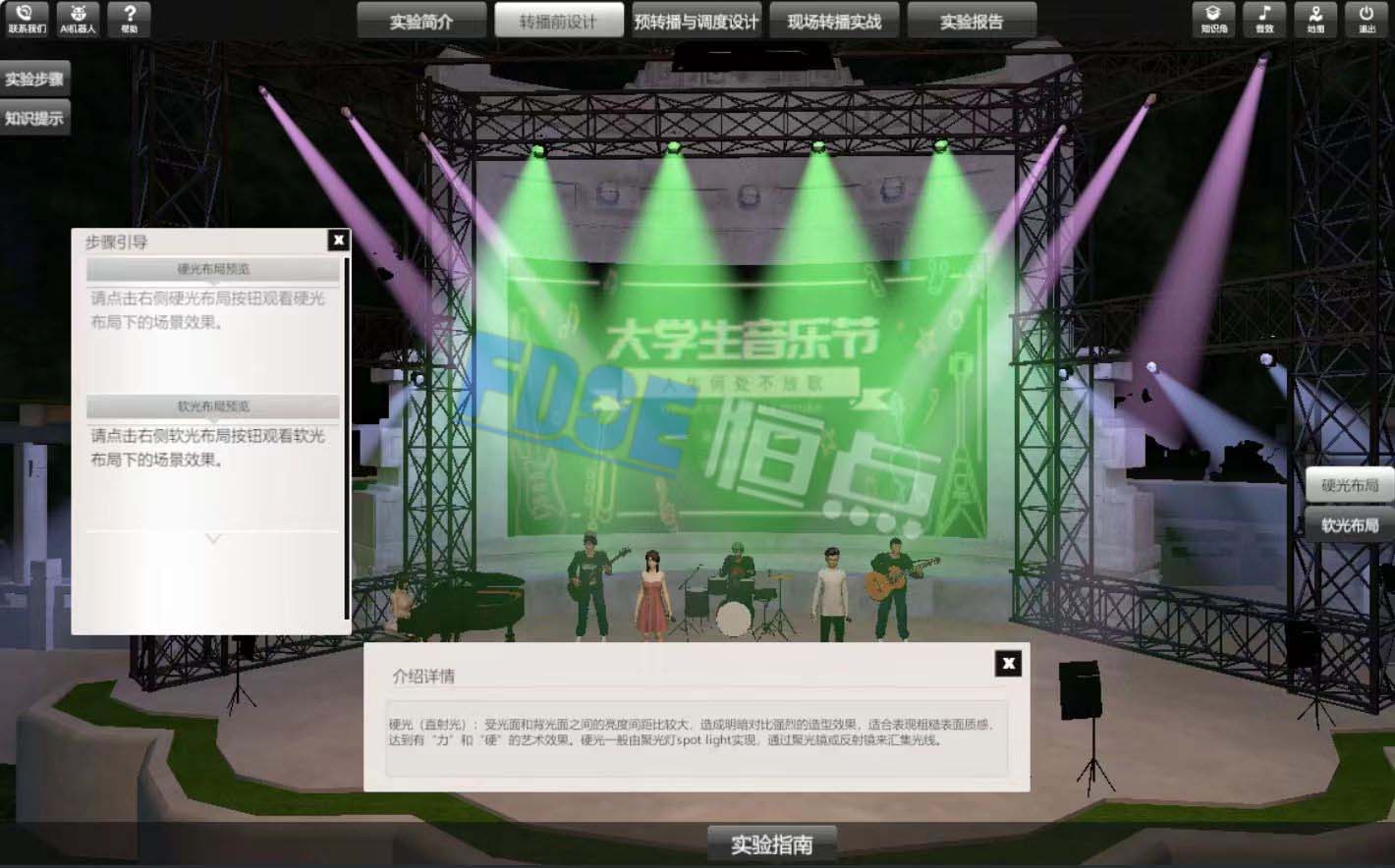 本实验紧扣现场 EFP 节目导播的特点进行设计,采用虚拟仿真这一创新教学方法,秉持以学生为中心、以能力培养为导向、以持续改进为原则的理念,引领学生置身于“大学生音乐节”的特定场景之中。