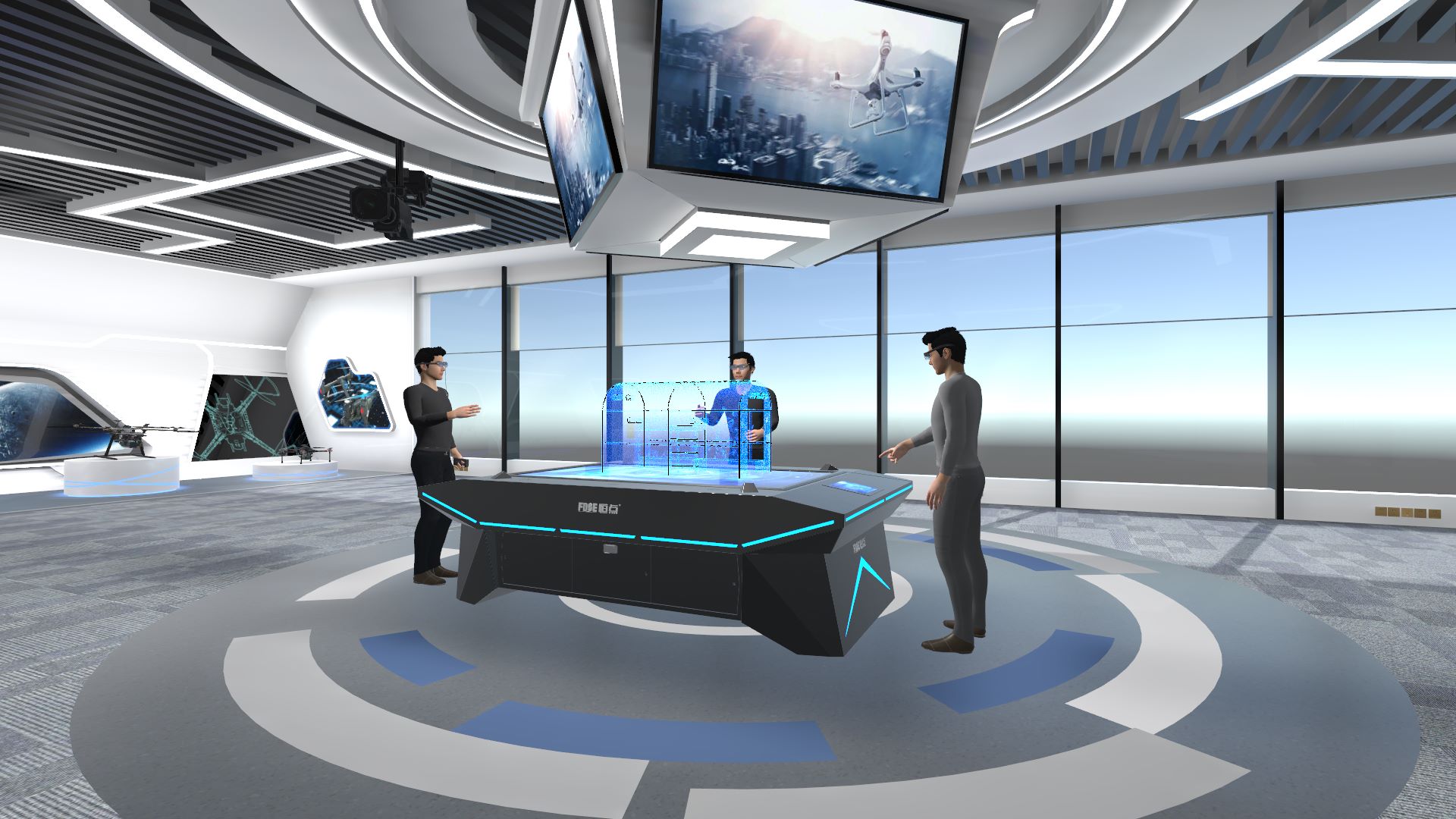 无人机数字模拟沙盘操作系统结合了增强现实、投影和虚拟交互技术,将各种三维虚拟场景进行立体化的展现,广泛适用于实训演练操作、模型展示、数据分析、指挥推演、资源部署等应用场景。同时利用恒点自研的软件引擎、内容平台、交互追踪和显示硬件等关键技术,构建虚拟无人机作战与作业环境,使得用户可以在其中操控物体、调整地形、修改场景等,通过手势、触摸或其他交互方式与虚拟环境进行互动。