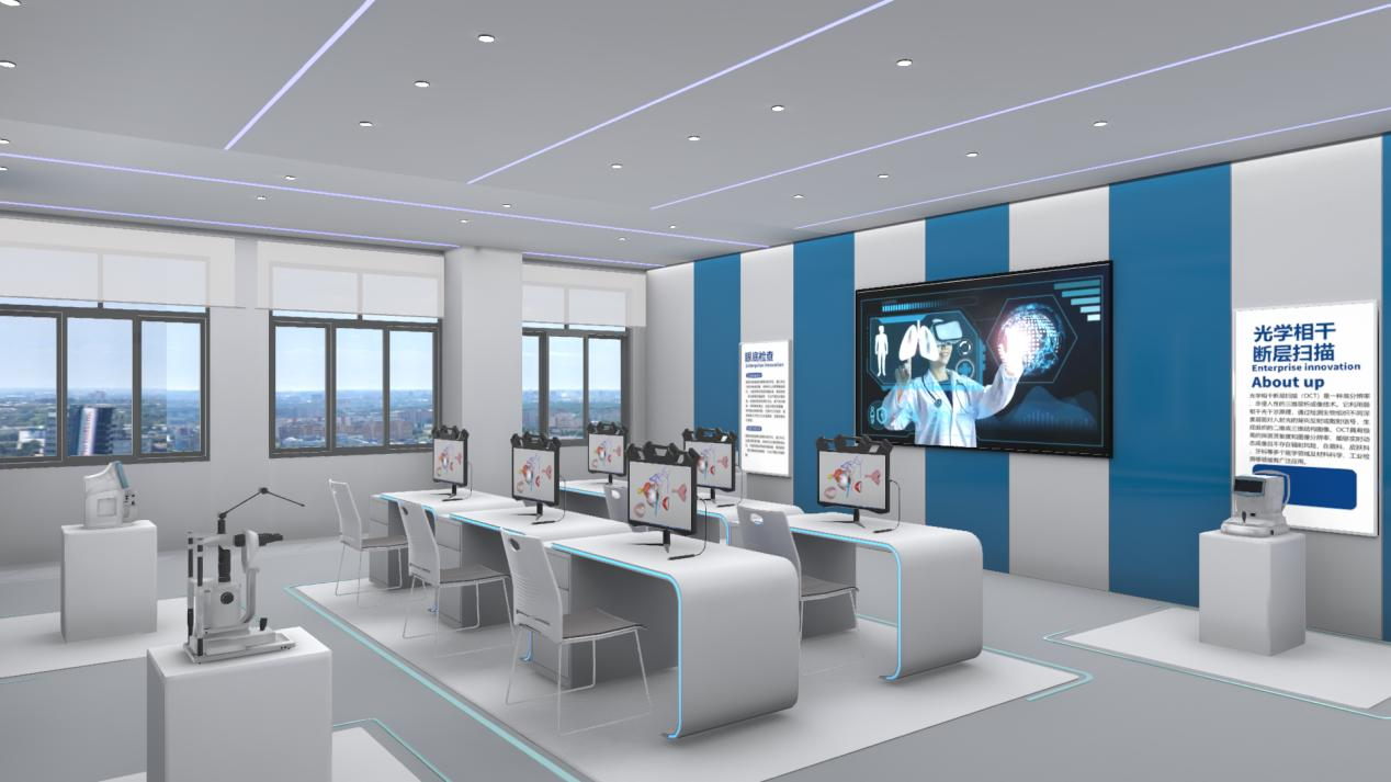 恒点通过虚拟仿真技术,以高精度3D画面,1:1复刻眼健康实操环境,实现高危操作的“零风险”还原,学生可无限次练习各类高危操作。如眼视光产业智能制造虚拟仿真实训基地,由视觉健康科普展览区、眼视光眼睛健康检测实训区、眼视光配镜实训区、眼视光产业智能制造实训区四大区域组成,实现了眼视光实训的全场景覆盖。