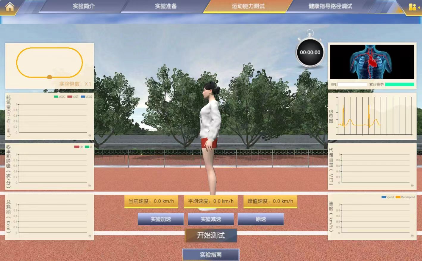 本实验融入“健康中国2030”国家战略行动,坚持“服务人与自然协同绿色健康发展”理念,致力于普及健康知识、提升健身素养,并提升专业学生为不同人群提供针对性的运动健身方案或运动指导服务能力。实验仿真程序和模拟数据均来自科研中的实际程序和实测数据,同时采用图形技术、3D仿真技术等手段对实验场景、人物进行建模并且1:1还原模型功能。