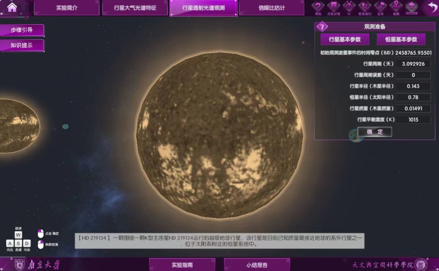 本实验依托南京大学双一流A+学科——天文学的《行星大气概论》专业课,借助虚拟仿真技术,搭建了低成本、可容错、自由度高的实验平台,克服了学生难以实操大型望远镜的缺憾(大型天文望远镜,空间望远镜视频),突破了传统天文观测中天气、台址等客观因素的限制,让学生可以全天候、多台址、自主地进行大气透射光谱探测实验。