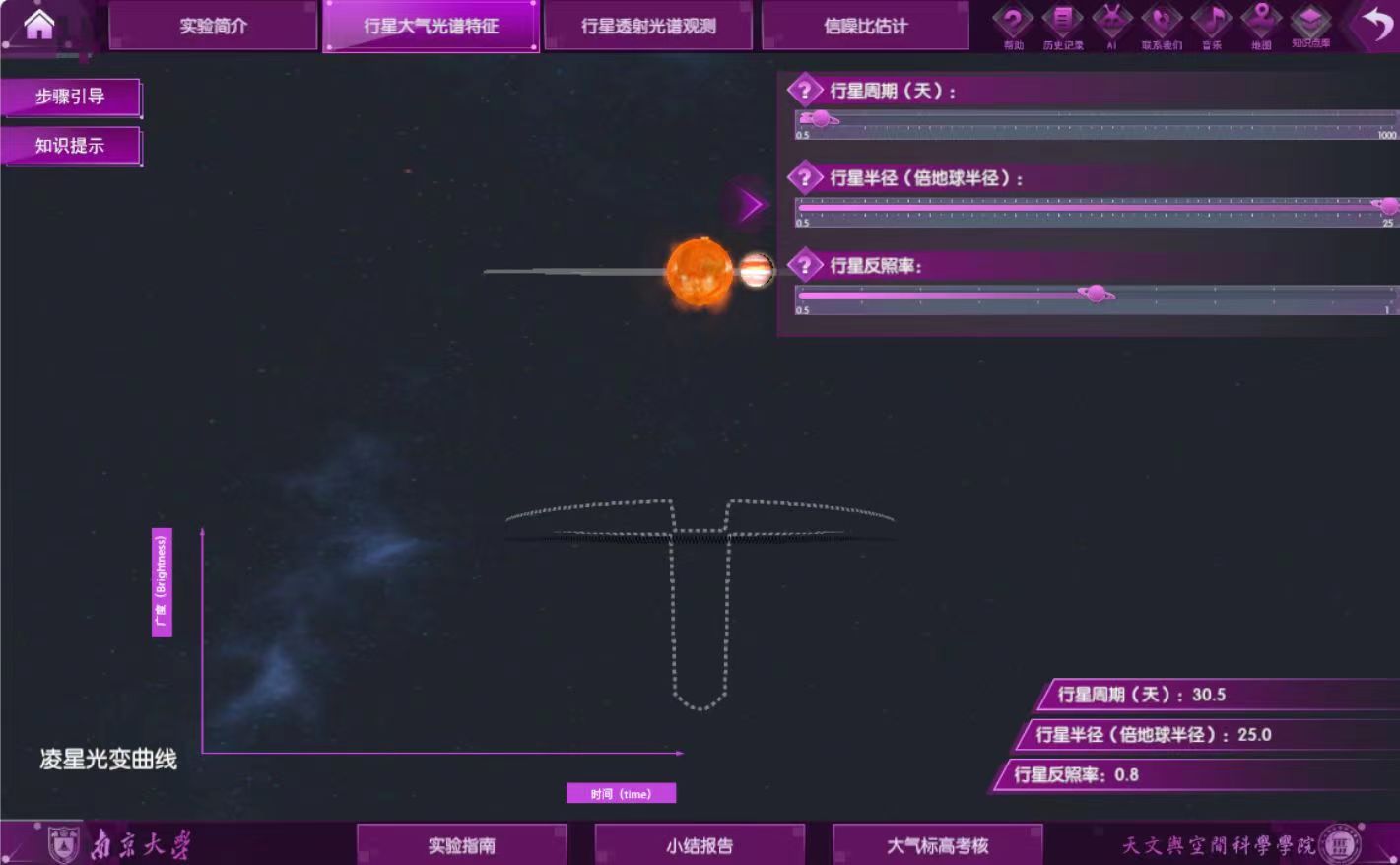 本实验采用虚拟仿真技术,突破大望远镜的硬件限制,突破时间和地域的限制,让学生可以全天候、多台址、自主地进行系外行星大气透射光谱探测的实验。
