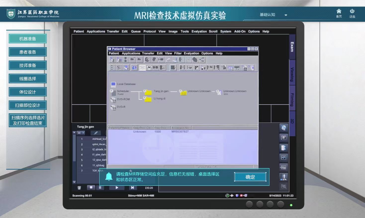为了更贴近临床真实岗位情境,有如真实的用户体验,6个常规检查项目根据临床MRI检查流程进行系统设计,每个项目的检查步骤包括填写患者登记页面、选择部位及序列、成像参数设置、查看图像、查看图像诊断报告和打印胶片等流程,且每个成像序列扫描时自带原MRI设备的序列声音,使学习者身临其境。