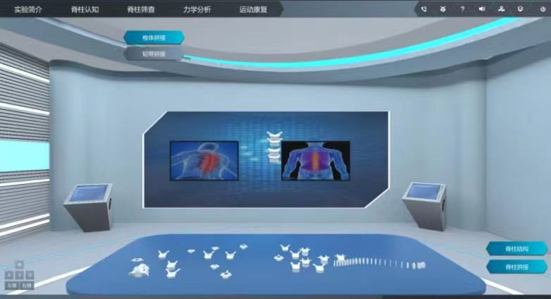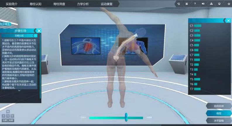 《脊柱运动康复生物力学虚拟仿真实验》项目包括脊柱认知、筛查、力学分析和康复手段共四个模块,内容涉及到运动解剖学、运动生物力学和运动康复等相关知识体系,提供了脊柱评估和个体化康复方案制定等虚拟仿真实验教学环节。
