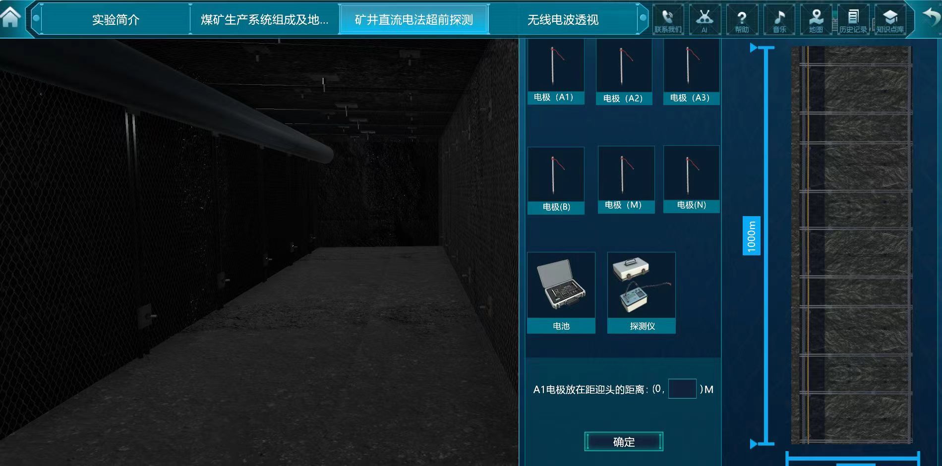 在虚拟的掘进巷道迎头,采用交互体验式的教学方式引导学生认识掘进巷道的地质元素,同学们可以通过手动方式在巷道迎头前方设置断层、陷落柱等地质异常,并采用交互式方式设计观测系统,将电极布置巷道底板相应位置,连接仪器。