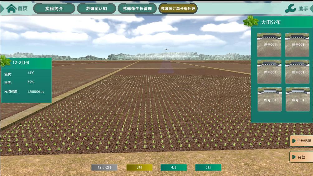 在搜集的实际苏薄荷种植数据基础上,实现苏薄荷订单化智能种植管理虚拟仿真实验。将中药苏薄荷的种植中的订单化与当前的大数据分析技术相结合。构建环境可测、数据可传、参数可调的高度仿真的虚拟实验场景,实验过程可多次重复,从而解决了实体种植过程中周期长、不可逆、不可重复的缺点。