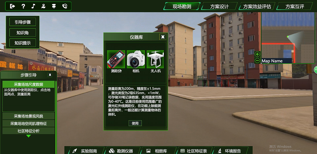 旧城社区景观更新设计虚拟仿真实验项目,以学生为中心,采用在线人机交互操作的方式,构建一种高度虚拟仿真的实验教学环境,将社区更新设计的全过程拆解为多个模块,让学生在接近真实环境的虚拟现场看到知识可视化呈现,最大限度地激发学生的自主实验兴趣以及创新设计的冲动。本项目包括了社区更新项目的现场勘测、方案设计、方案效益评估、方案互评四个环节,共计8学时。通过各实验环节和步骤的设计,力求实现以下教学目标:
