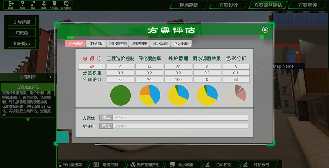 3)通过对设计方案经济性、生态性、艺术性的多元量化评估,强化相关行业规范和设计标准,并在虚拟仿真实验中可重复进行优化设计,引导学生统筹协调各设计要素形成最优方案,提升学生的综合设计能力和解决复杂工程问题的能力。