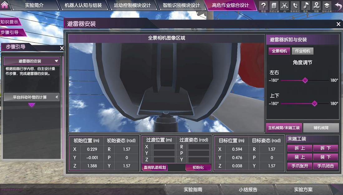 实验下发了10Kv配电线路避雷器更换的工作任务,通过对拆卸避雷器的工作任务分解使学生理解理论知识在实际场景中的具体应用,引导学生结合视觉处理、路径规划、末端控制等内容完成复杂环境下的高危作业。