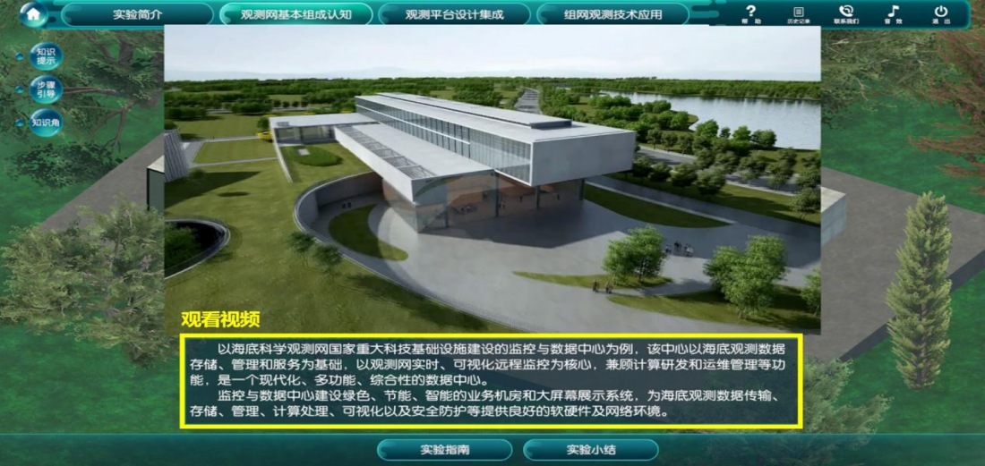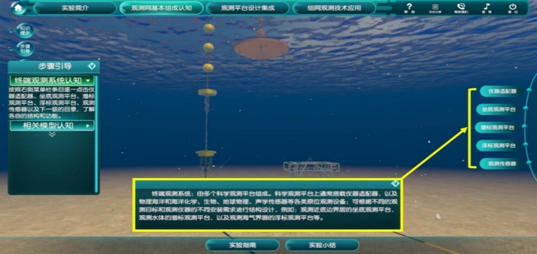 为形象生动地传授海底科学观测网组网观测新知识,本项目团队遵循“学生为本-循序渐进-容错优化-科教融合”的设计原则,自主开发了海底科学观测网组网观测虚拟仿真实验。