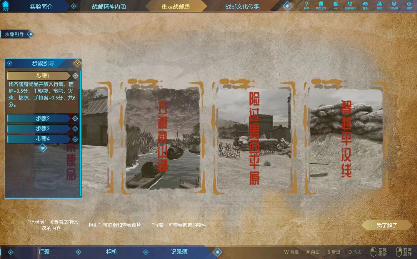 紧扣“重走战邮路”实验主线,通过解锁勇接光荣使命、巧渡微山湖、险过鲁西平原、智越平汉线等实验关卡,要求学生独立操作实验系统,让学生尝试不同路径选择,学生只有作出符合科学革命理论和具体革命实际的选择,才能完成实验任务,从而提升学生独立思考问题、分析问题、解决问题的自主学习能力。