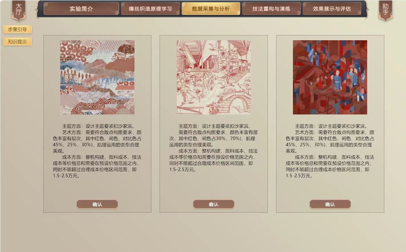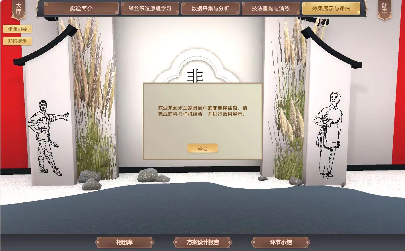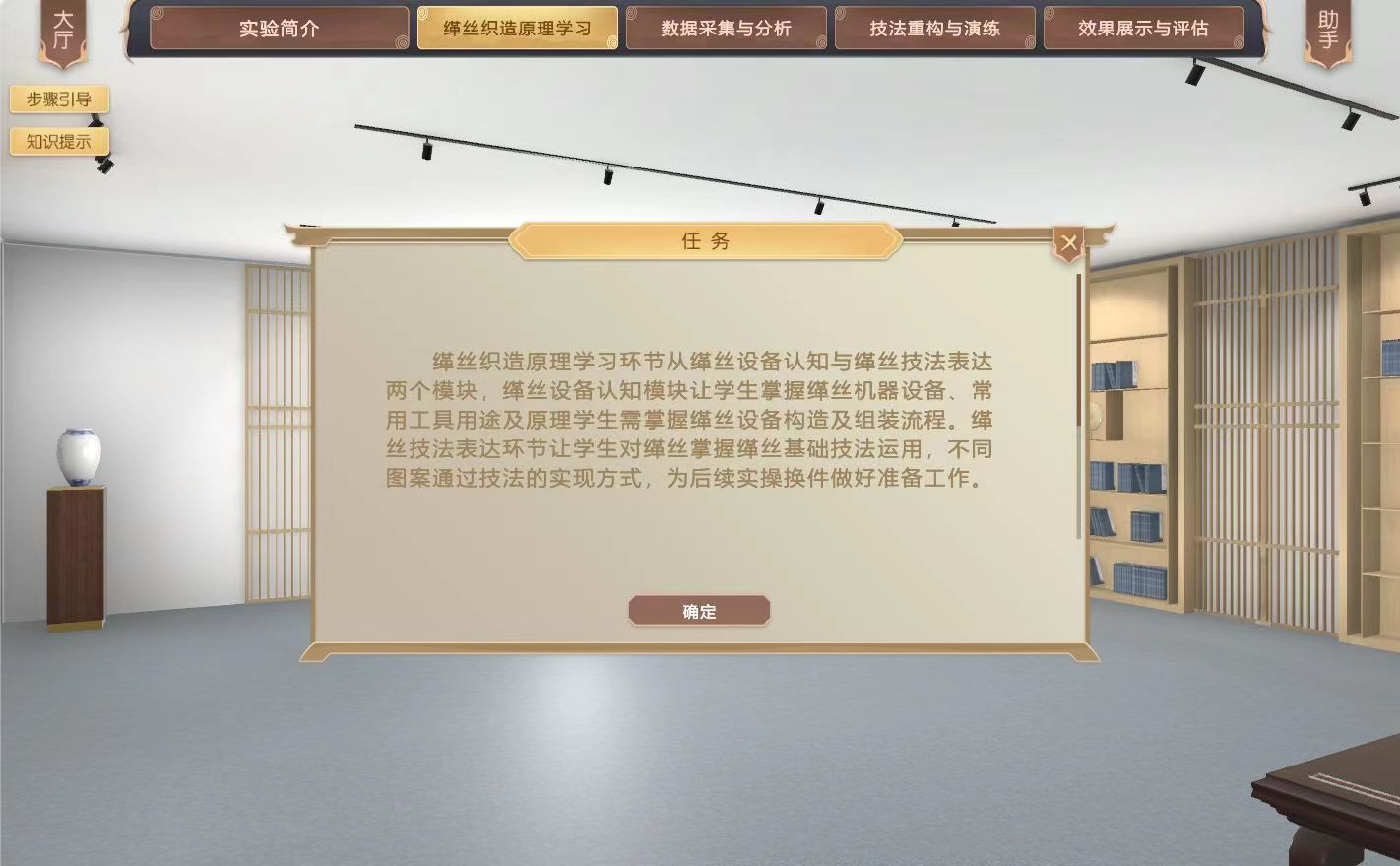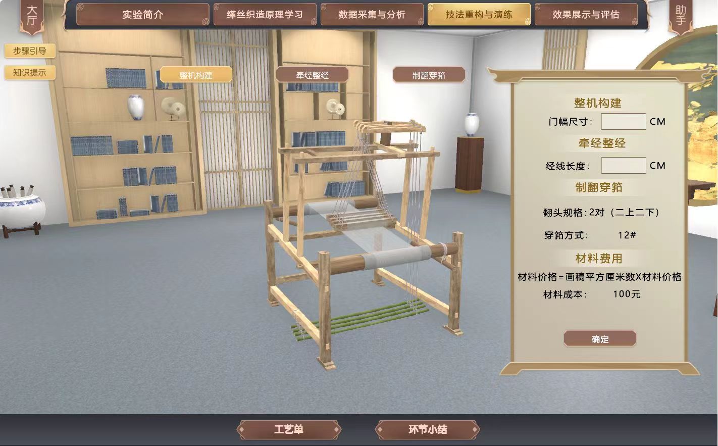 在充分掌握缂丝的历史文化知识、工艺织造原理和缂丝文化内涵的基础上,结合沙家浜采风的灵感素材,依托虚拟现实、多媒体、人机交互、数据库和数值模拟等信息化技术,构建高度仿真的虚拟实验环境和实验对象,展示缂丝技艺实验的操作要点,实现真实情况下缂丝机器稀缺,制作周期过长而难以完成的教学任务。结合虚拟仿真系统的人机交互功能,促使学生在虚拟环境中开展实验,达到所要求的认知与实践效果。
