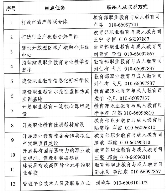 各重点任务建设指南将在现代职业教育体系改革管理公共信 息服务平台(网址:http://zj.chinaafse.cn/, 以下简称管理平台) 予以公布。各地要积极组织有关政府部门、学校、企业、产业园 区承接重点任务,明确各重点任务牵头建设单位(以下简称建设 单位),根据各重点任务建设指南的要求,整合教育产业政策资 源、形成建设方案(含年度绩效目标)并上传管理平台,自主开展建设,接受监督调度。各项目咨询联系人及联系方式见附件。
