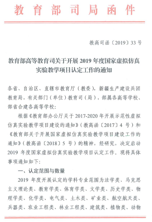 教育部高等教育司关于开展2019年度国家虚拟仿真实验教学项目认定工作的通知