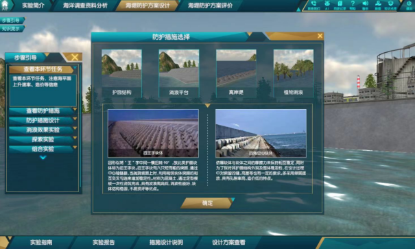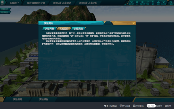 在整体的实验设计上,本虚拟仿真实验通过教师引导、任务设置、模块分解,学生自主独立地完成海洋调查资料分析、海堤防护方案设计以及防护方案综合评价等各模块任务,明确每一个模块的具体要求、实验目标,提升学生的自主学习能力、实践能力以及综合分析能力。