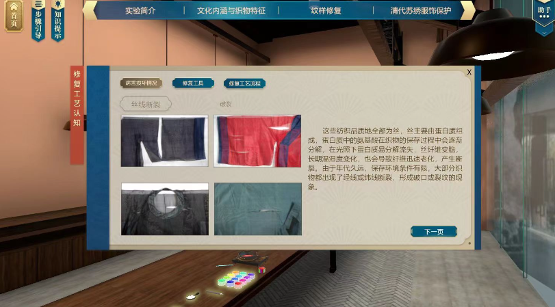 重现修复过程:虚拟仿真实验室可以将清代苏绣服饰的修复过程进行重现,包括清洗、整理、缝补等各个环节,使学生能够更加直观地了解修复技艺的流程和要点。