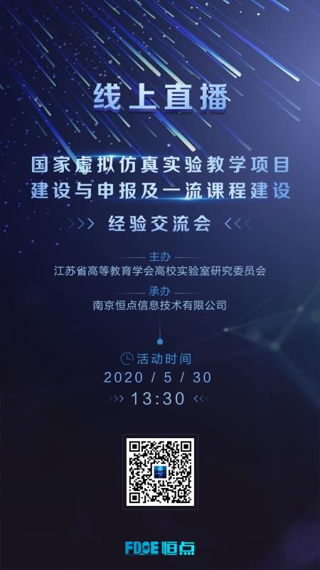 结合国家虚拟仿真实验教学项目建设与申报的工作,经研究决定, 由江苏省高校实验室研究会主办,南京恒点信息技术有限公司承办的“国家虚拟仿真实验教学项目建设与申报及一流课程建设经验交流会”,将于5月30日通过网络直播的形式进行。