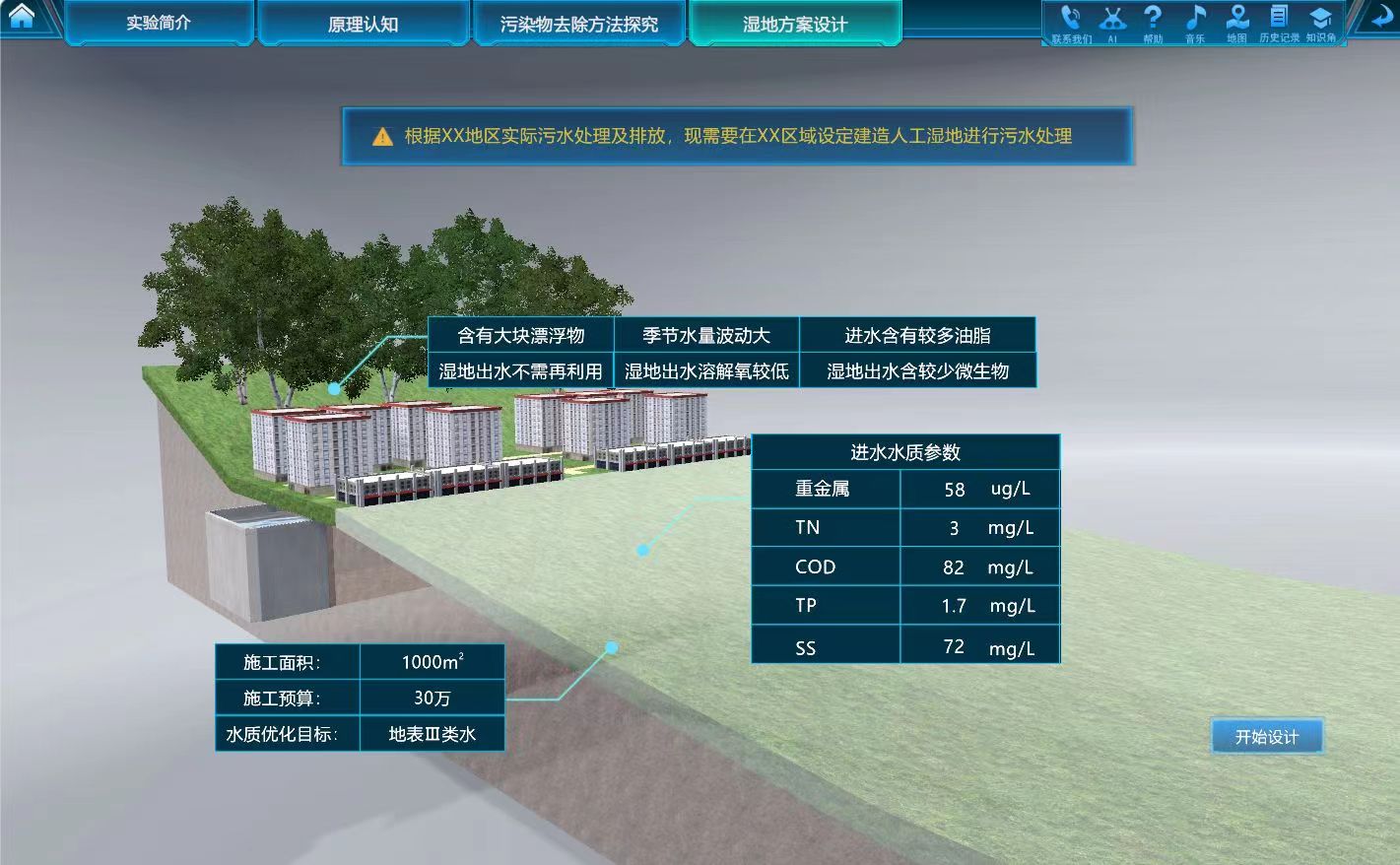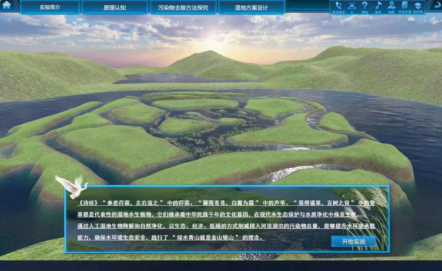 人工湿地生态修复技术虚拟仿真实验通过互动思考题的智能反馈、在线教师问答功能,提高学生学习人工湿地的主动性和互动性,进而全面掌握人工湿地的要点。