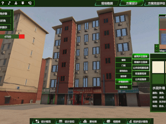 2.社区景观更新方案设计 社区景观更新方案设计包括设计定位、居住建筑外里面更新设计、商铺建筑外立面更新设计、社区公共空间景观设计、社区街道更新设计、公共设施更新设计、设计设计方案展示相关知识点,在社区场景中,选取系统内置的设计素材,进行建筑,公共空间、街道、公共设施的更新设计,并在完成设计后通过虚拟拍照,撰写设计说明,完成设计方案。