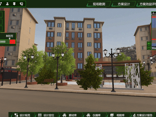 旧城社区景观更新设计虚拟仿真实验项目,以学生为中心,采用在线人机交互操作的方式,构建一种高度虚拟仿真的实验教学环境,将社区更新设计的全过程拆解为多个环节,让学生在接近真实环境的虚拟现场看到知识可视化呈现,最大限度地激发学生的自主实验兴趣以及创新设计的冲动。本项目包括了社区更新项目的现场勘测、方案设计、方案效益评估、方案互评四个环节 1.社区景观更新现场勘测 以江苏省南京市雨花南路为基础,通过3D虚拟场景,利用虚拟勘测仪器对现有社区环境进行虚拟测量,练习和认知景观设计现场踏查的国产与方法,明确社区特征的构成要素。掌握场地尺度数据采集、景观风貌采集、空间肌理特征采集在内的场地踏查内容与方法;并通过查阅地块背景资料及设计任务书,对社区特征进行调查与分析。