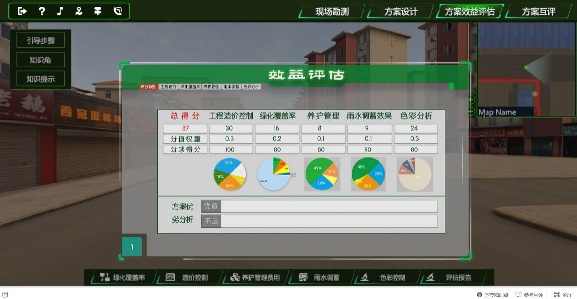 设计方案效益评估包括绿化覆盖率、造价控制、养护管理费用、雨水调蓄、色彩分析5个知识点。系统根据选取设计素材的内置参数进行计算,得出绿化覆盖率、工程造价、养护管理费用、雨水调蓄、色彩控制的量化数据,并参照相关行业规划和标准,生成方案效益评估得分。 |