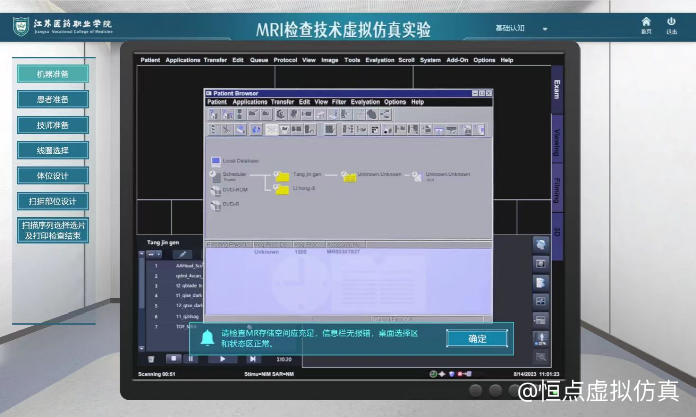 基于高仿真的每个检查步骤,包括填写患者登记页面、选择部位及序列、成像参数设置、查看图像、查看图像诊断报告和打印胶片等流程,且每个成像序列扫描时自带原MRI设备的序列声音,使学习者身临其境。通过动画和语音提醒加深学生的记忆和理解,提高课堂效率。