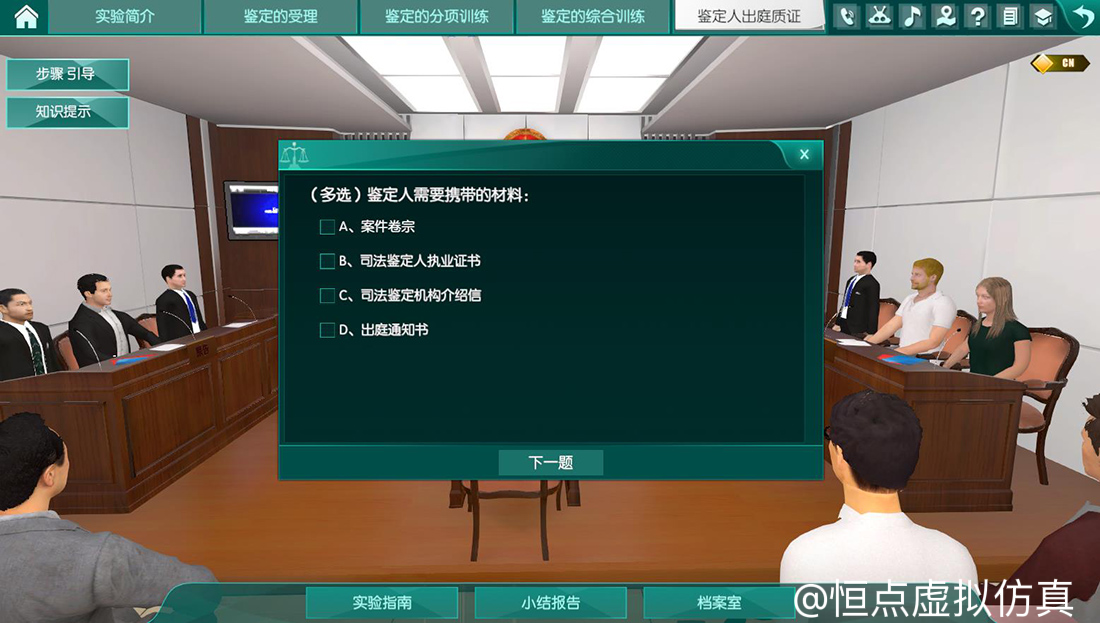对此,恒点与南京师范大学共同推出了“国际诉讼纠纷中的文书司法鉴定虚拟仿真实验(中英双语)”实验。本实验旨在通过创新的虚拟仿真技术,提供一个高效、互动且双语的学习平台,以培养适应国际化需求的法治人才。