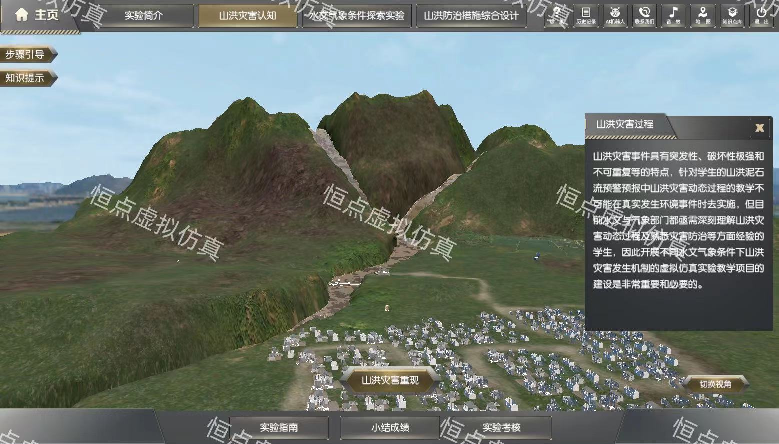 恒点与南京信息工程大学共同开发设计的“暴雨山洪灾害的发生与防治虚拟仿真实验”在知识传授点额基础上,协同相应的能力培养、素质提高,学生通过对虚拟仿真项目各个实验模块的操作,直观地参与大规模山洪灾害防治,提升实践创新能力,为水利人才培养注入新的动力。