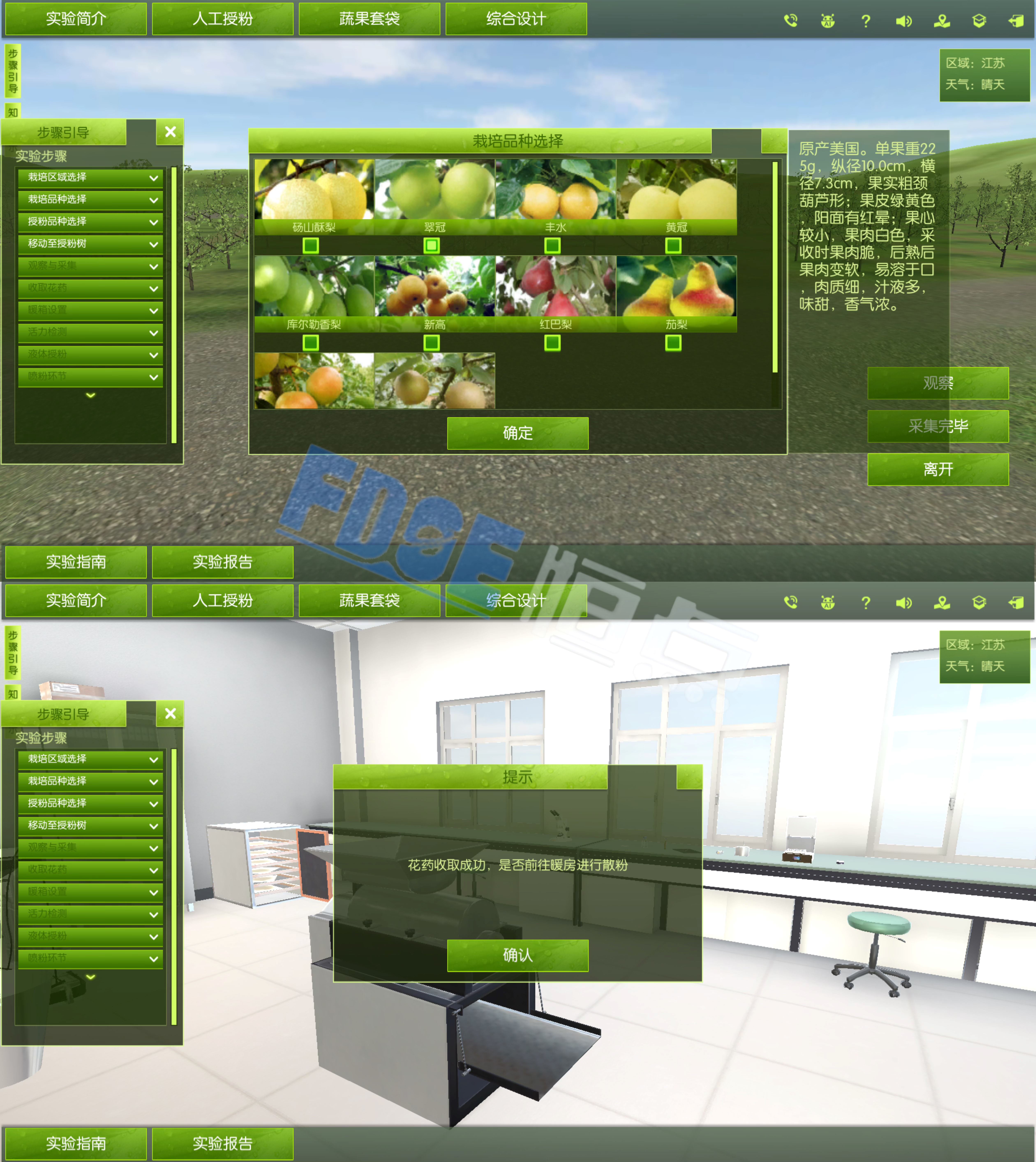 通过《梨花果人工授粉虚拟仿真项目》,让学生可以选择合适的梨子种类,采集花粉,使学生掌握花粉的培育过程以及了解培育过程所用到的仪器。