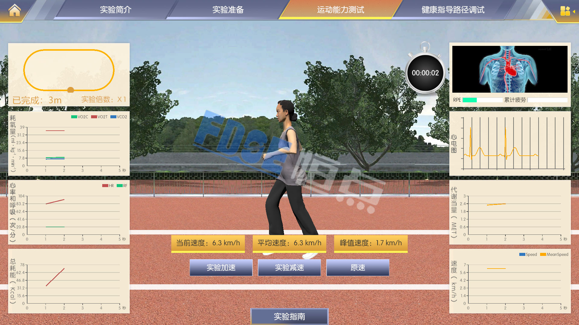 针对以上问题,恒点与南京体育学院以相关科研和教学成果为基础,共同开发“城市路径健身指导虚拟仿真实验”,构建高度仿真的虚拟实验环境和实验对象,通过本实验学生能够熟悉有氧运动能力测试的技术原理和常用设备,熟悉递增负荷试验的流程,掌握有氧运动能力的评价方法,掌握紧急终止试验的指征并且能够在出现意外时做出及时准确的判断。最终能够综合判断健身者的健康状态、有氧运动能力、锻炼习惯,结合温度、湿度等环境参数,制定合理的走、跑健身路径,以及确定合理的持续时间和运动强度。