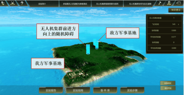 多旋翼无人机装配与群体协同虚拟仿真实验,旨在学生掌握多旋翼无人机装备参数与调试,无人机群群链路预算与组网,无人机集群协同与自主避障相关的技术原理和实验方法。培养学生分析和解决工程的能力,本项目通过建模,为学生提供了虚拟的,面积约为64平方公开的某海岛。上面有敌我双方的军事基地。我方基地有:无人机装备实验室,试飞场,以及14种多旋翼无人机组件,并且1:1还原了模型功能。