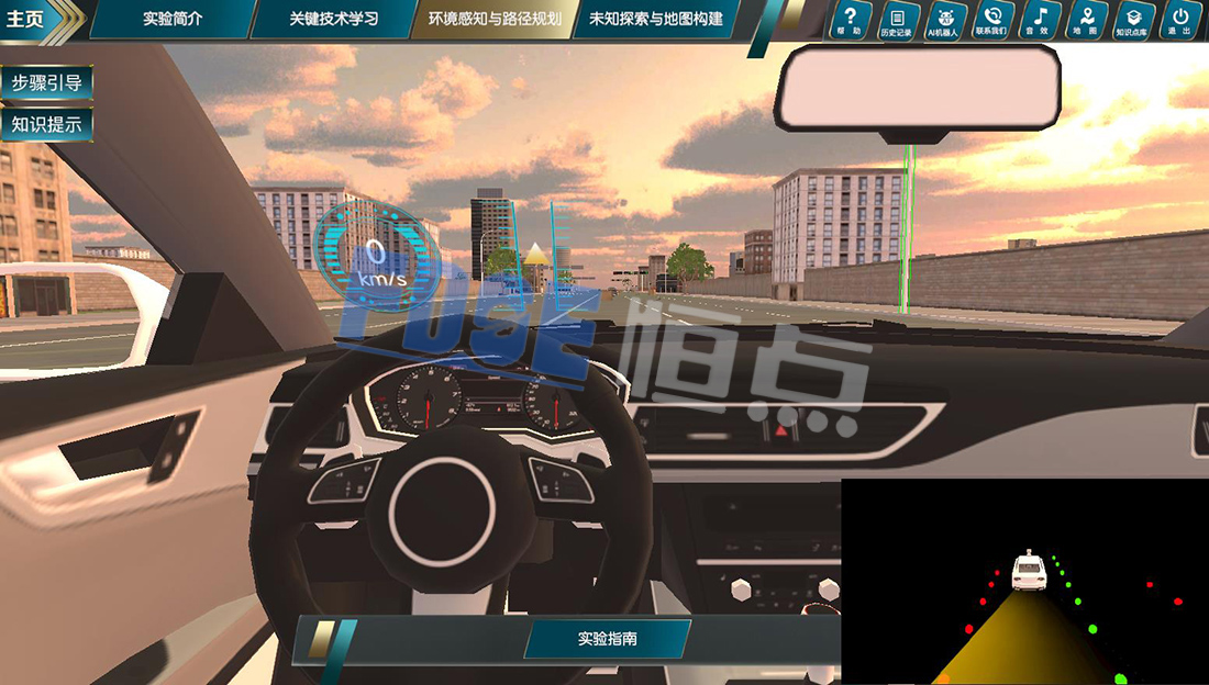 恒点与南京理工大学共同开发,无人驾驶环境感知与自主规划虚拟仿真实验项目,遵循“能实不虚,虚实结合”的原则,旨在通过虚拟仿真技术,模拟真实的无人驾驶环境,让学生在安全、低成本的环境下进行先期测试、设计的相关学习和实践,从而安心开展充分试错,提升探索创新能力。项目设计坚持学生为中心,采用问题导向的设计方法,通过环环相扣的实验环节,将知识学习和能力提升有机融合。