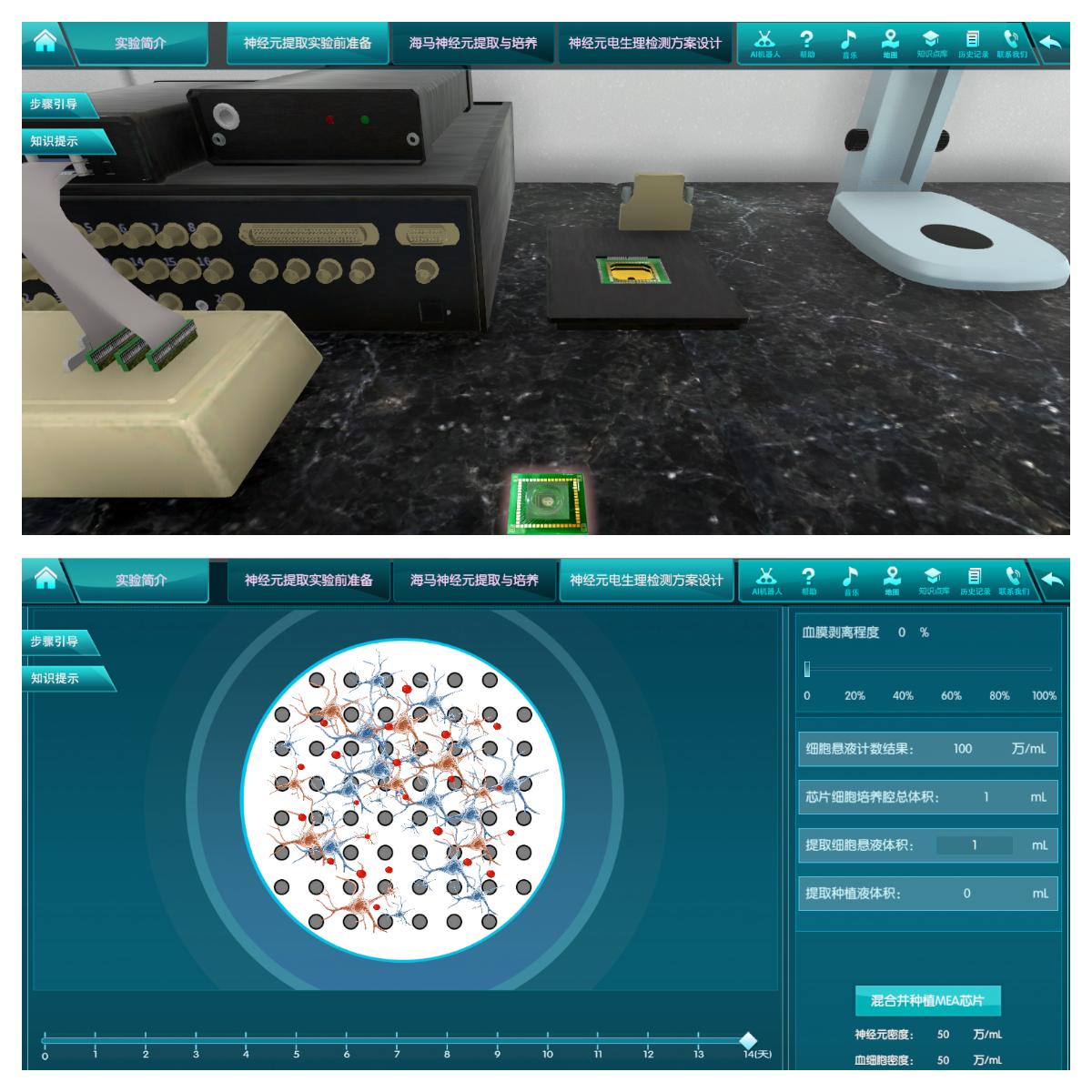 恒点与南京航空航天大学开展校企合作,创新地将虚拟仿真技术用于相关教学,共同开发脑神经元网络电信号微电极采集与分析虚拟仿真实验。循序渐进的课程设置,合理化教学难度;交互式实验操作,培养学生的实操与探究能力,弥补传统教学的不足。