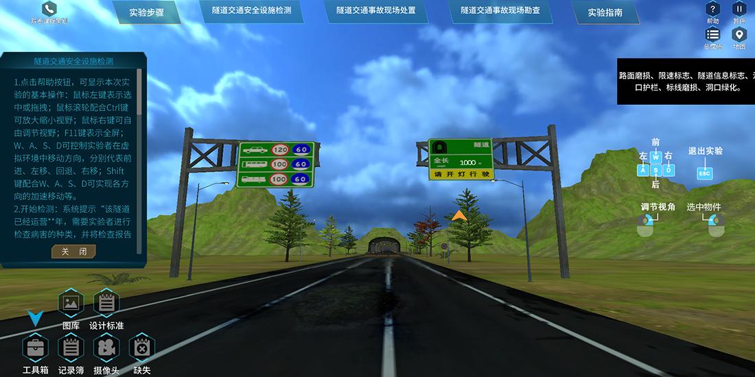 实验项目遵循“能实不虚”的设计理念,分为隧道运营安全设施检测、隧道交通事故现场处置及隧道交通事故现场勘查三个环节。每个环节都针对不同的公路管理人才工作需求,如道路管理工程师、道路养护工程师、道路交通警察等。软件利用非线性函数分析预测隧道交通事故的时间分布、空间分布、事故类型及车辆特征,进而设置特定的交通事故现场,实现高度仿真的虚拟环境,实现了产、学、研的高度融合。