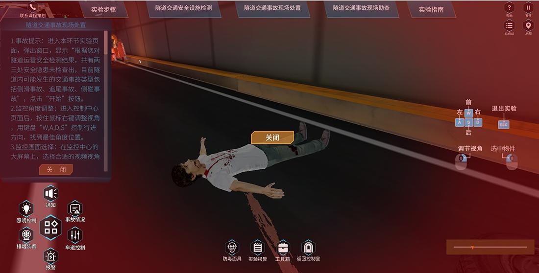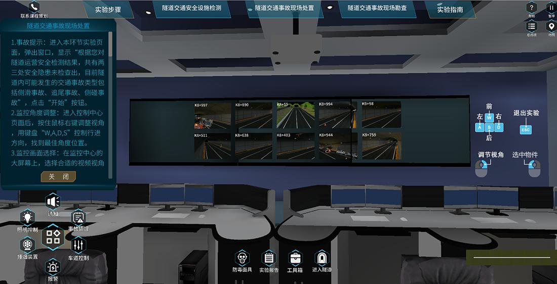 实验环节二:隧道交通事故现场处置,学生将在虚拟仿真环境中选择合理的事故应急处置策略,降低事故危害,同时培养交通事故安全处置意识及实践操作能力。