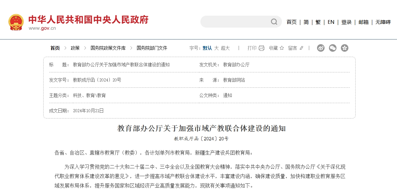 为深入学习贯彻党的二十大和二十届二中、三中全会以及全国教育大会精神,落实中共中央办公厅、国务院办公厅《关于深化现代职业教育体系建设改革的意见》,进一步提高市域产教联合体建设水平,丰富建设内涵,确保建设质量,加快构建职业教育服务区域发展布局体系,提升服务国家和区域经济产业高质量发展能力,现就有关事项通知如下。