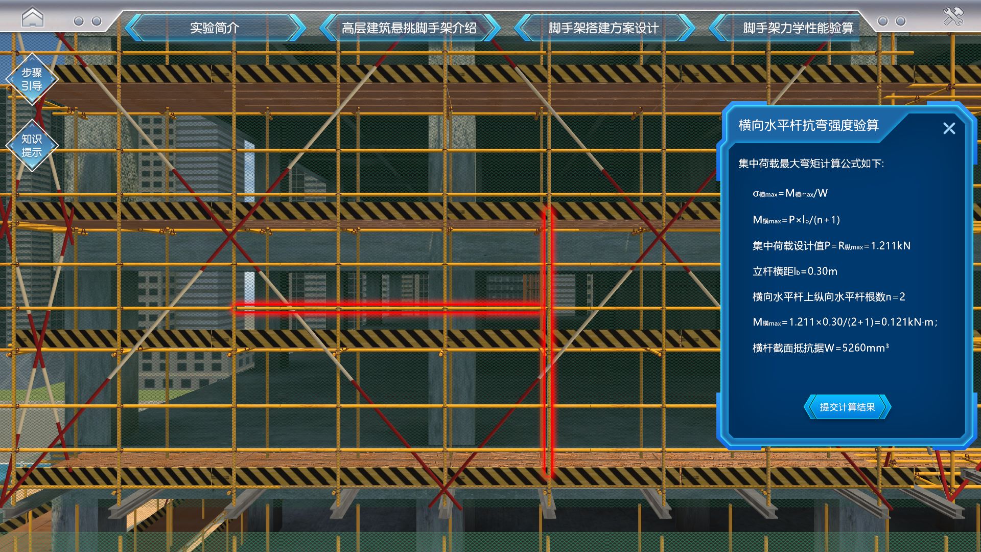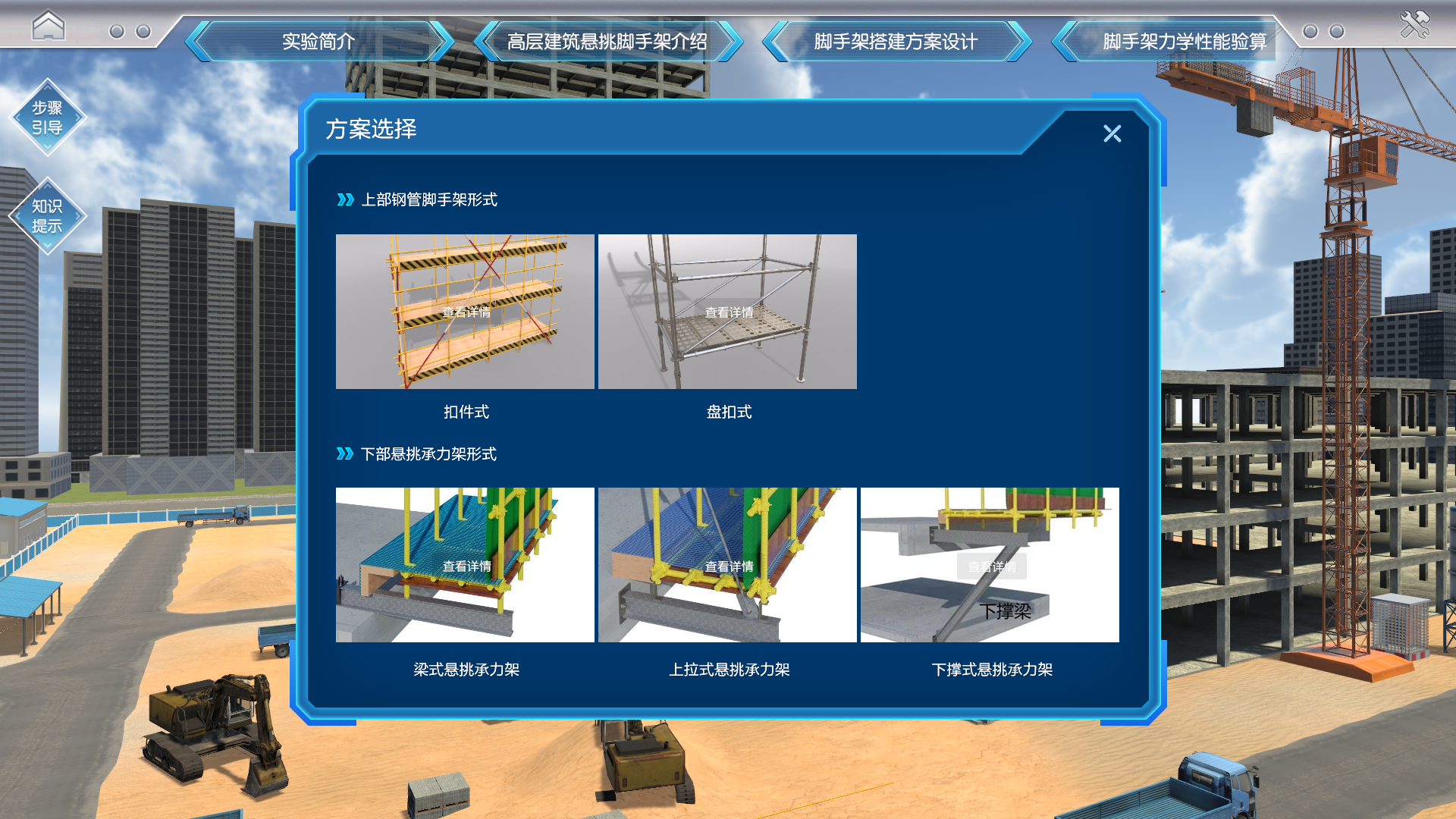 对此,恒点与常州工学院针对高层建筑施工作业安全防护的现实需求,依托实际工程案例,结合行业发展趋势,采用虚拟仿真技术设计了“方案选型—设计验算—施工管理”三个逐层递进的实验教学模块,高度逼真地再现了悬挑脚手架设计施工的核心要素和动态过程,解决了传统教学中实验成本高、危险性大、周期长、交互性差等难题。