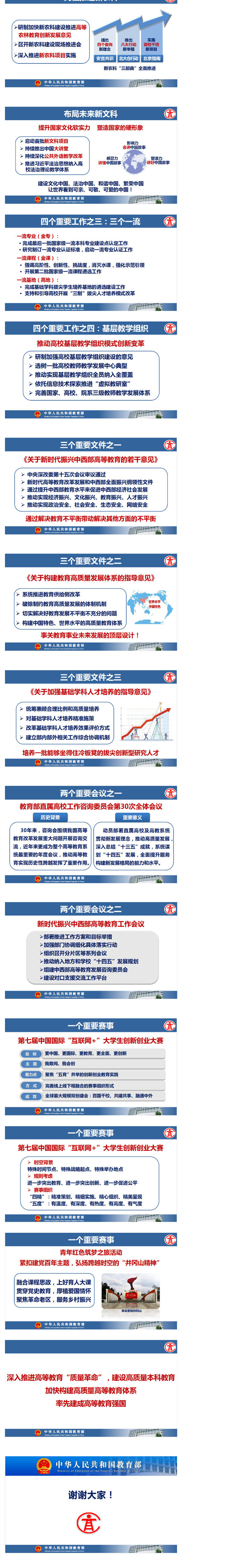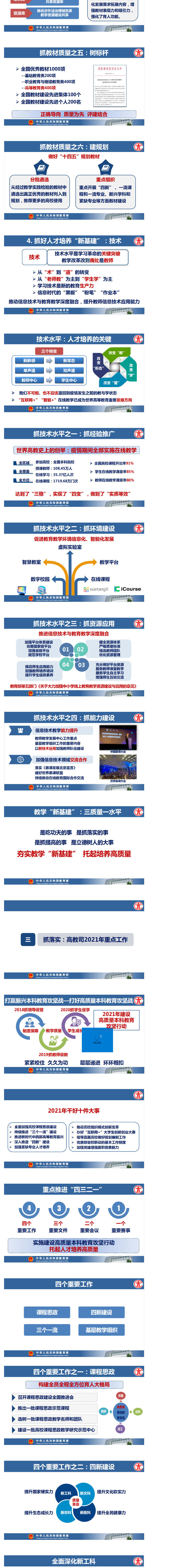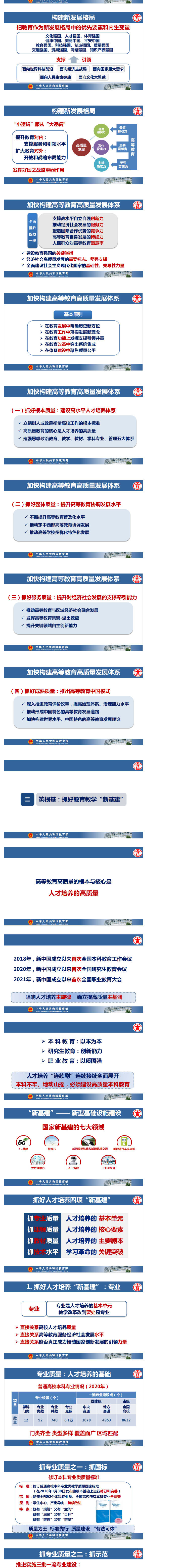 本次会议对高等教育相关工作进行动员部署,要求各省(市、区)教育厅(教委)、各高校、各教指委委员要把握新发展阶段,把新发展理念贯穿高等教育改革发展全过程和各领域,把教育作为新发展格局中的优先要素和内生变量,发挥好国之战略重器作用,加快构建高等教育高质量发展体系。吴岩同志在《夯实教学“新基建” 托起培养高质量》主题报告中指出,高等教育高质量的根本与核心是人才培养质量,专业、课程、教材和技术是新时代高校教育教学的“新基建”,要全面落实立德树人根本任务,抓好专业质量、课程质量、教材质量和技术水平,实施建设高质量本科教育攻坚行动,扎实推进高校课程思政,深化一流专业、一流课程、强化高校基层教学组织建设,深入推进高等教育“质量革命”,加快构建高质量高等教育体系,建成高等教育强国。