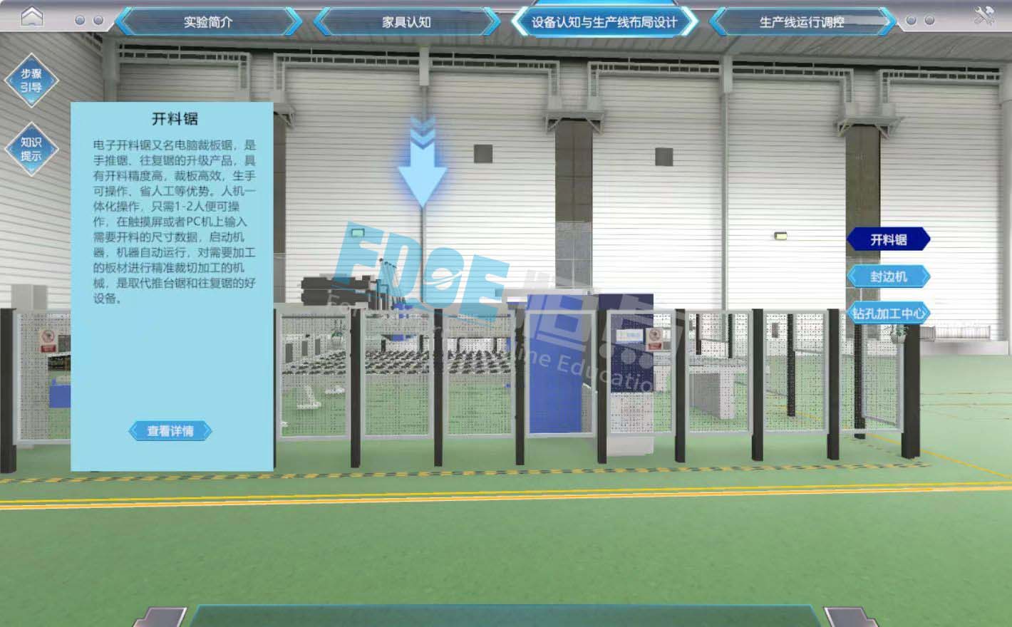 面对这些挑战,虚拟仿真技术的应用提供了一种全新的解决方案。通过构建家居定制智能生产线设计与优化虚拟仿真实验,教育内容得以与行业需求无缝对接,实验内容覆盖从接单到发货的全业务活动。利用虚拟仿真技术,我们可以提供一个低成本、高效率的实践教学环境,解决了实验设备成本高、数量少的问题,同时丰富了实践教学资源。