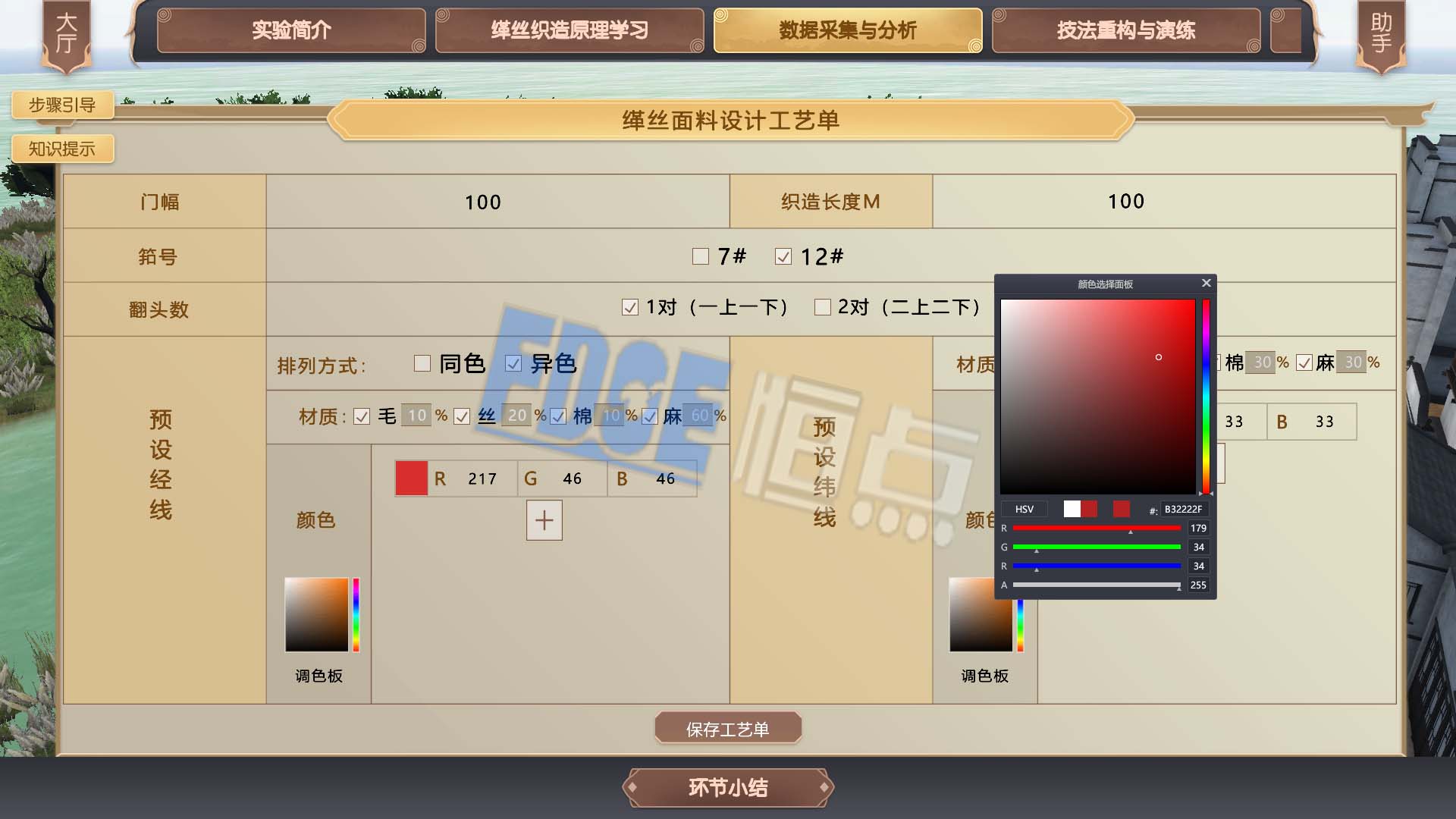 虚拟仿真实训能够模拟不同工艺参数下的生产情况,如纱线张力、织造速度、印染温度等。通过调整这些参数,学生可以预测不同条件下的产品质量和生产效率,从而找到最优的工艺参数组合。