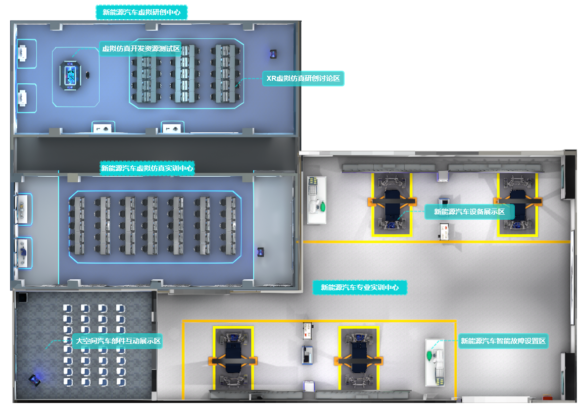 新能源汽车虚实结合实训基地主要由新能源汽车虚拟研创中心、新能源汽车虚拟仿真实训中心、新能源汽车专业实训中心三个部分组成,可以分别实现课程自研、虚拟仿真实训、实体实践的功能。